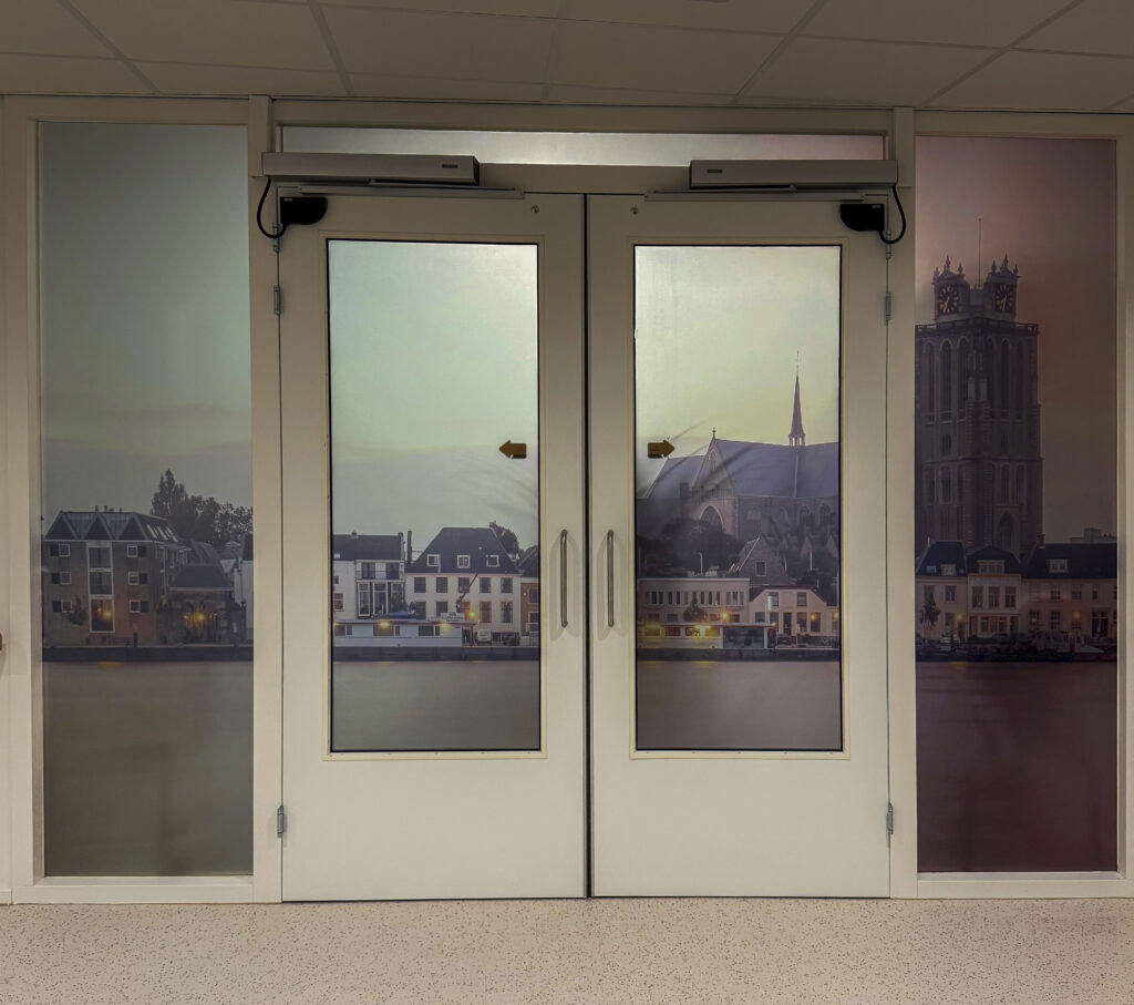 Bijgaande foto ontvangen van Projekt van Zanten uit Zwijndrecht. Bij Hospice de Patio in Dordrecht hebben zij bedrukking op ramen en deuren aangebracht met mijn foto van de skyline van Dordrecht bij zonsopkomst.